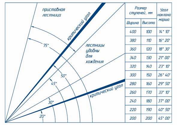 - Уклон одного лестничного марша должен быть постоянным. Оптимальные углы наклона показаны на схеме.