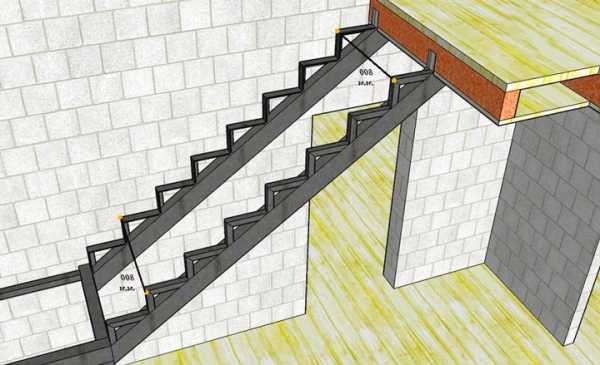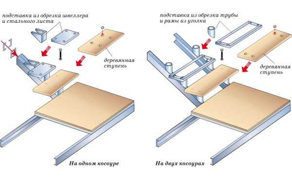 Для крепления ступеней могут использоваться кобылки из труб, уголков или швеллера. Также можно крепить их непосредственно к тетиве. Тогда нужно рассчитать интервалы расположения креплений и разработать чертежи для ступенчатых косоуров.