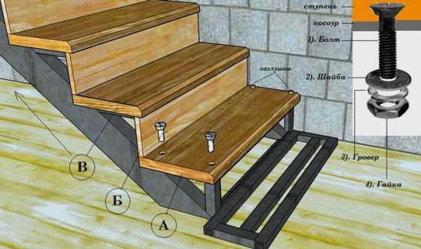 Последний этап – приваривание ступеней к кобылкам. Можно также закрепить их болтами, их в этом случае надо обшивать деревом. Еще один вариант – установить деревянные ступени прямо на кобылки с помощью винтовых соединений.