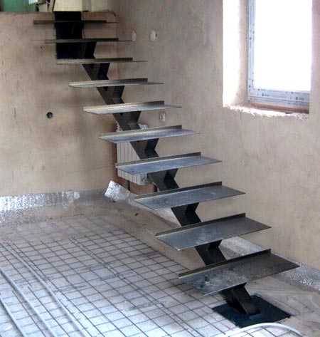 На косоурах. На одном косоуре, то есть на двутавре или швеллере. Они играют роль опоры, их размещают посередине конструкции и прикрепляют ступени. Данные лестницы выглядят воздушными, лёгкими, но нагрузку выдерживают с достоинством.- На тетиве.