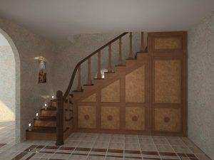 Лестница при помощи подсветки и фонтана превратилась в струящийся водопад. Создается чувство, что попал в фантастическую страну и скоро по лестнице спуститься принцесса эльфов.Если остановить выбор на стандартной деревянной лестницу, имеющей поворот на 45 градусов, то ради экономии места под ней можно разместить полки, вместительные встроенные шкафы или расположить другие элементы интерьера.