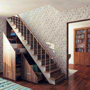 Еще один интересный проект лестницы с прекрасной организацией пространства под ней. Здесь полки и шкафчики. Поместиться много различных вещей.Обычно маршевые лестницы применяют, если в помещении большой перепад уровней. Если перепад более трех метров, то лестничный марш разделяют площадкой.