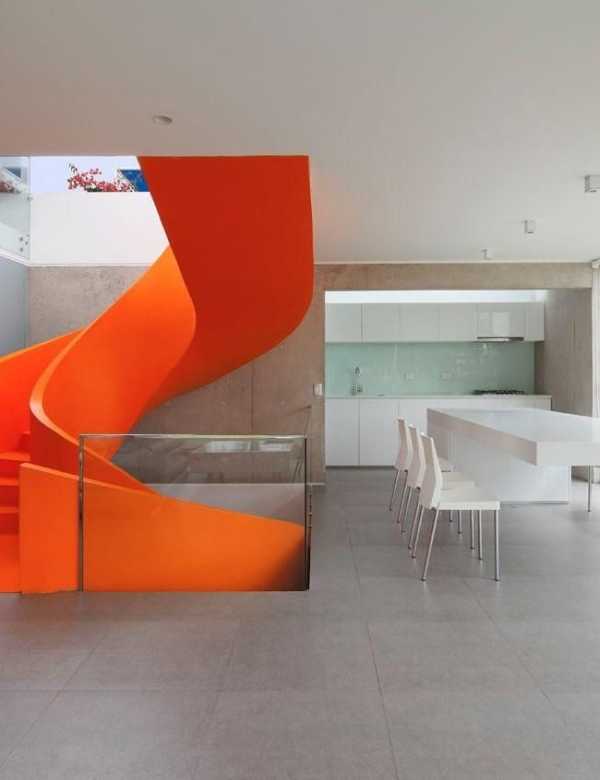 Винтовая лестница без перил напоминает позвоночник животного. Минимализм в конструкции как нельзя лучше подойдет для помещения в современном стиле.Спиральная лестница имеет особую привлекательность. Она будет хороша для домов в стилевом оформлении рококо, ампир, модерн.