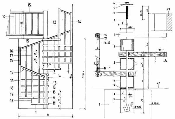 1. Первая конструкция состоит из простых ступеней, имеющих клиновидную форму. Широкий конец каждой ступени опирается на стены, которые окружают лестницу, а узкий конец крепится на опорный столб. Последний, в свою очередь, выполняется из толстых концов самих ступеней или же из кирпичной кладки.