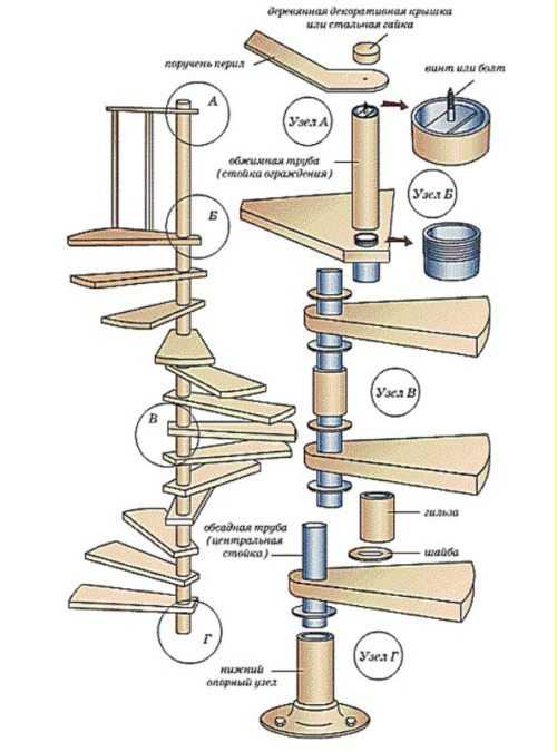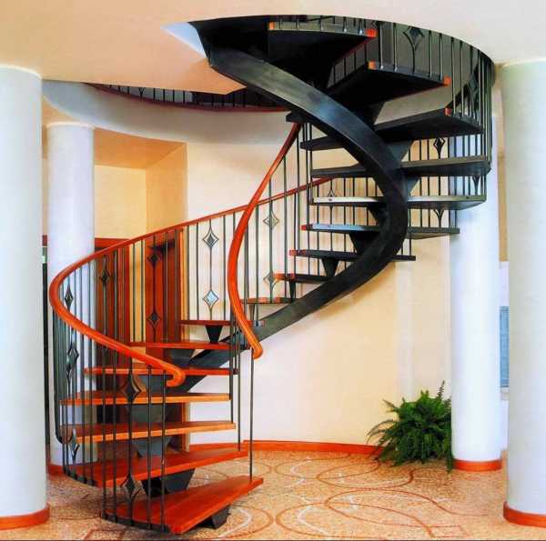 Как известно, винтовая лестница состоит из опоры, ступеней и перил. Все они могут быть выполнены из одного материала или же комбинироваться между собой. Итак, из чего изготавливают каждый из элементов лестницы?