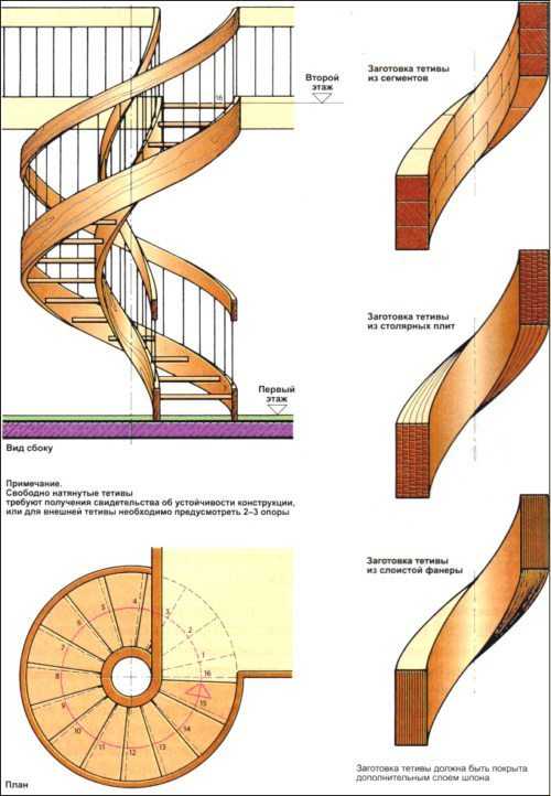 - опора ступеней на изогнутую тетиву и ограждение — такая конструкция лестницы не предусматривает центральной опоры. Ступени монтируются в изогнутые спирально тетивы, служащие в то же время и заграждениями. Изготовление такой винтовой конструкции сопряжено с определенными сложностями, однако, она имеет очень привлекательный и оригинальный вид;