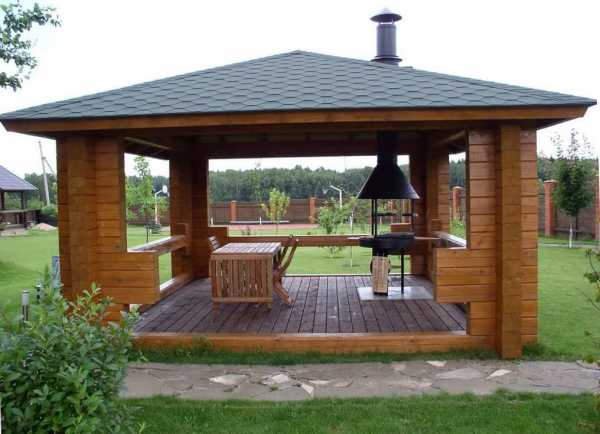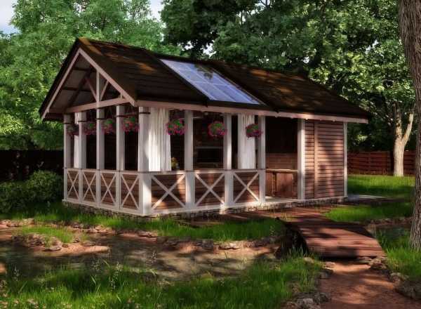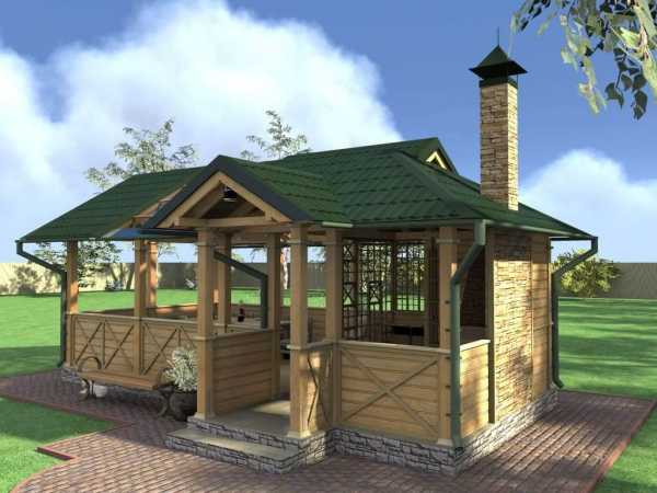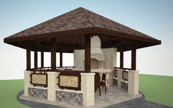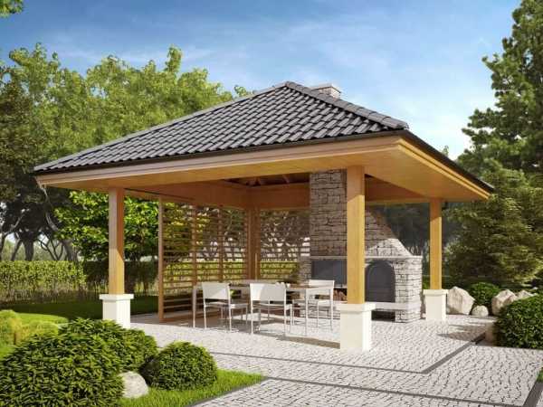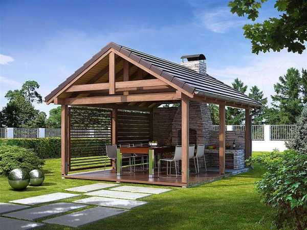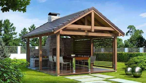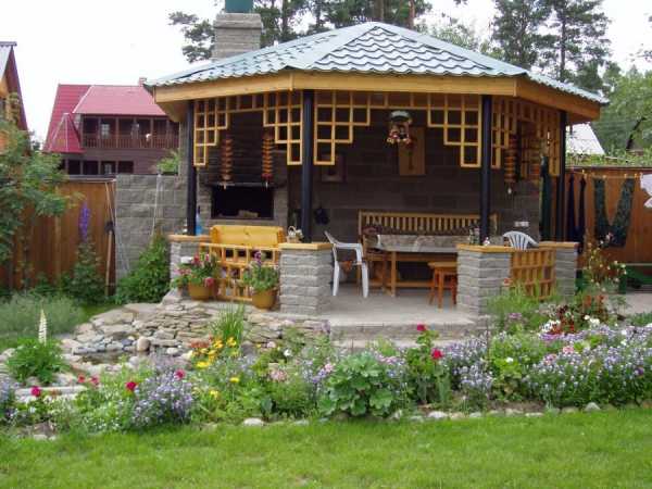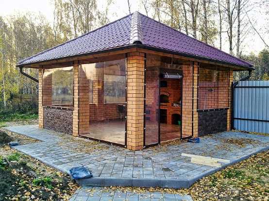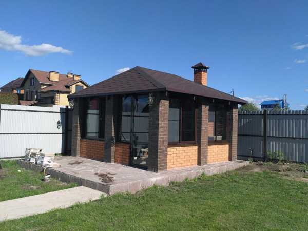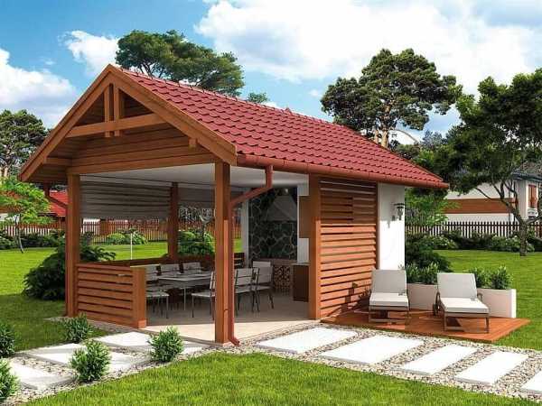 Летняя кухня-беседка с двухскатной крышей из черепицы