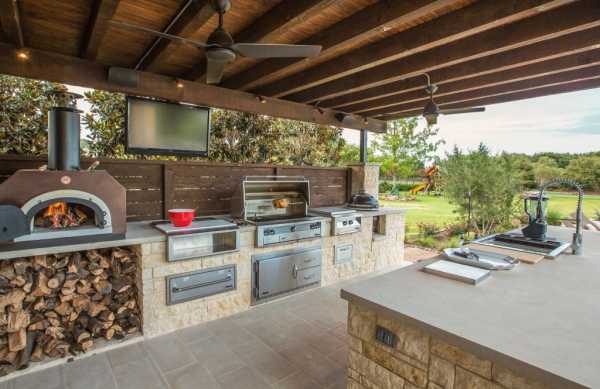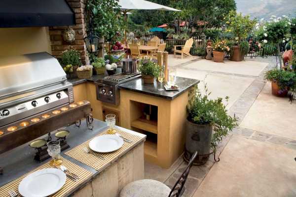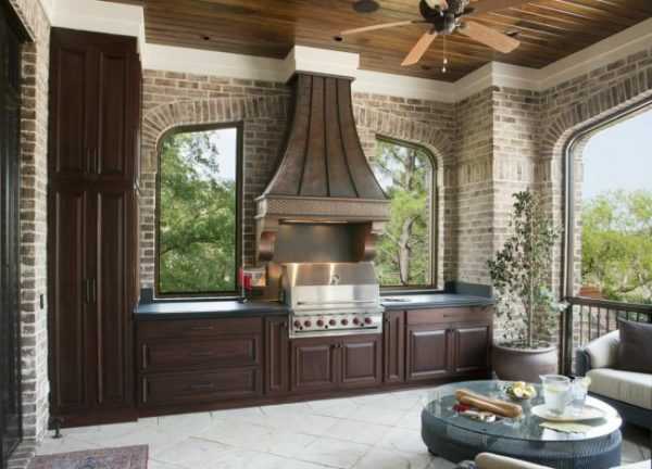 Проекты летних кухонь с барбекю или мангалом пользуются особым способом