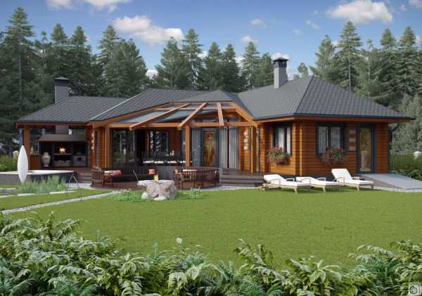 Летняя кухня из оцилиндрованного бревна с большими окнами в пол
