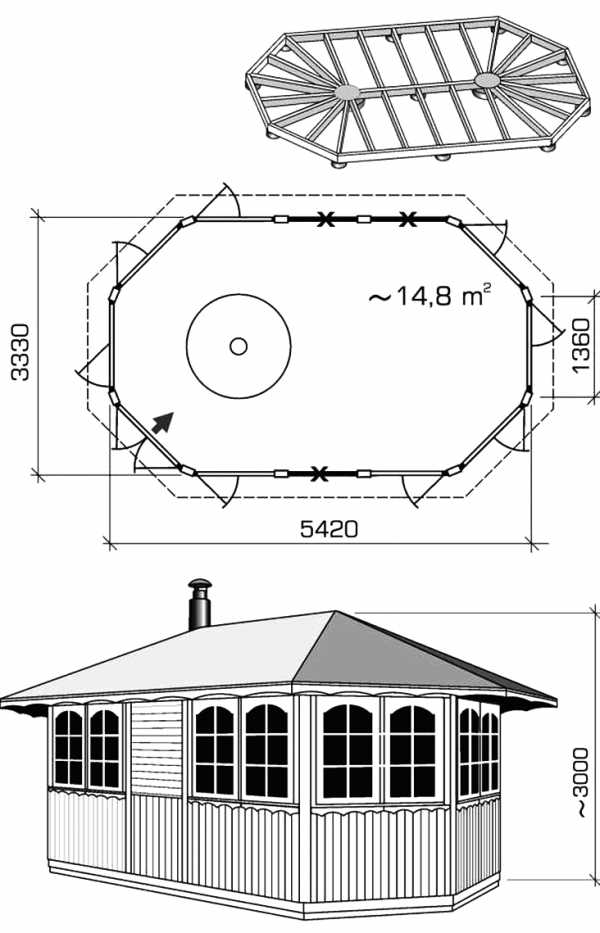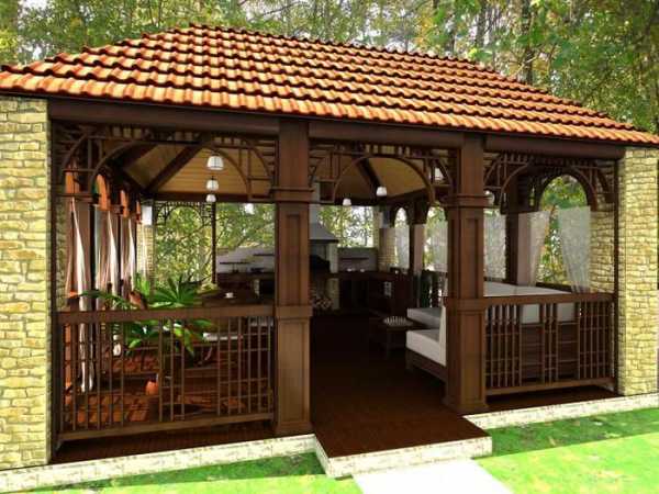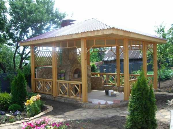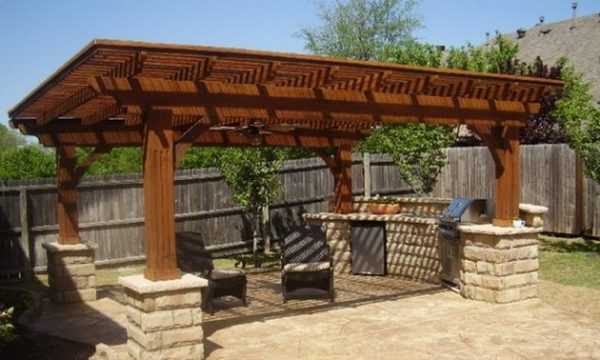 Для начала закладывается фундамент, затем создаётся каркас конструкции из камня, бруса или кирпича, потом – крыша. Подходящий материал для кровли — ондулин или битум. Одну стену рекомендуется сделать полностью закрытой, а вдоль неё установить кухонный гарнитур, печь. Остальные стены можно оставить открытыми, задекорированы фигурными решётками с обвитыми растениями, прикрытыми при помощи перегородок или штор.