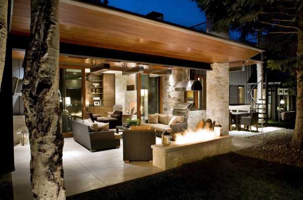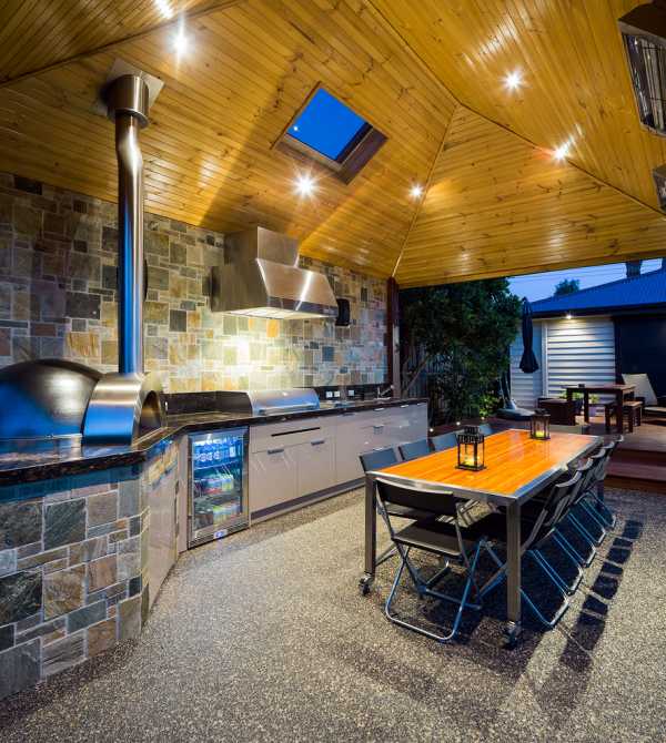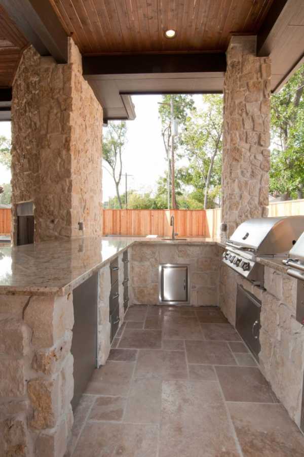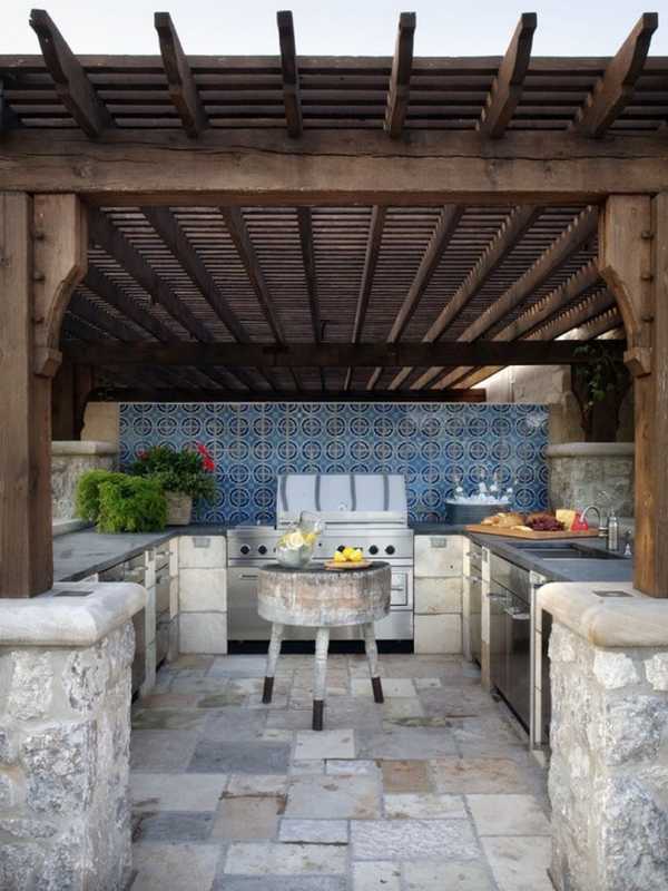 Стильный дизайн современной летней кухни изготовленной из натуральных материалов