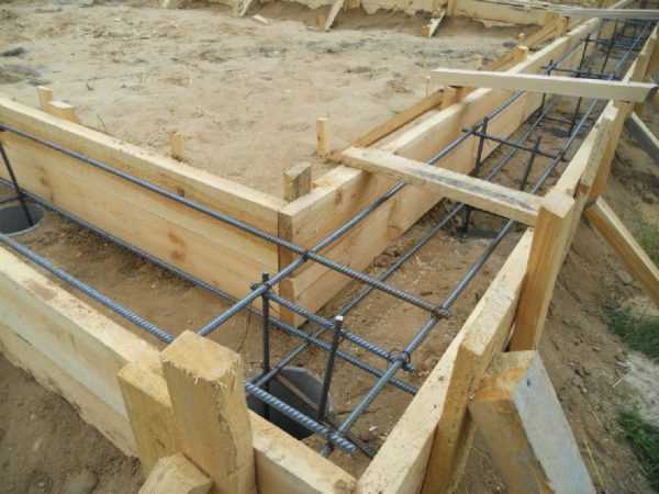 - Ленточный фундамент. Сперва на участке делают размету, которую отмечают на плоскости фиксированными колышками с натянутой между ними веревкой. Далее роется котлован (глубина 40-60 см.), по периметру которого с обеих сторон устанавливается опалубка из досок или влагостойкой фанеры. Затем, чтобы избежать пучения грунта, делается подсыпка из утрамбованного сеяного песка и щебня. Перед тем как залить бетон, в траншею опускают арматуру и связывают её проволокой с помощью специального крючка. Фундамент должен выстоятся не меньше 30 дней. Если повезло с погодой приступить к строительству можно через 2 недели.
