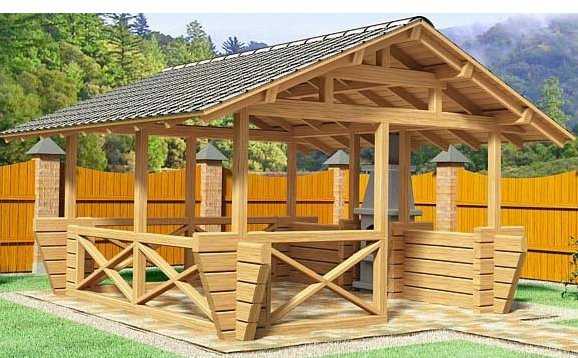 Для постройки кухонь открытого типа обычно используют деревянные брусья. Готовые деревянные строения смотрятся красиво, при этом их постройка требует небольших временных и денежных затрат. Деревянные части скрепляются посредством шурупов и саморезов. Балки скрепляются алюминиевыми уголками. Внешняя часть стен здания отделывается доской. Внутренняя – обшивается вагонкой или гипсокартоном. Отделочные материалы должны обладать специальной пропиткой, препятствующей их гниению.