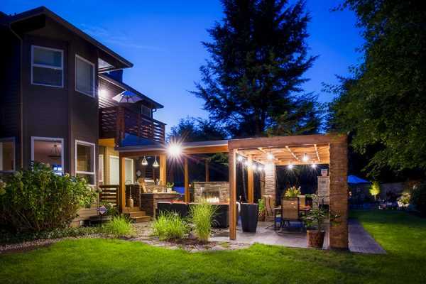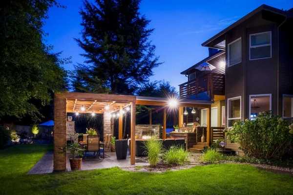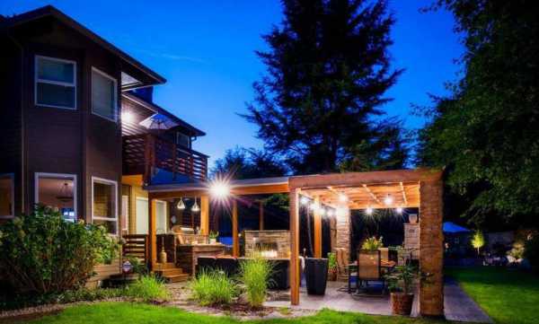 Общий стиль задает освещение. Оно должно быть функциональным. Дорожку, ведущую к отдельно стоящей беседке, можно оформить фонарями со светонакопительными элементами – они впишутся в ландшафтный дизайн, украсят участок и сделают безопасным проход к летней кухне.