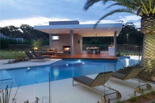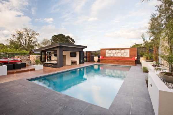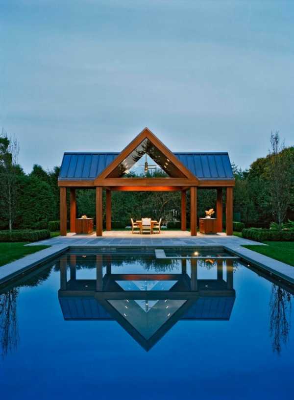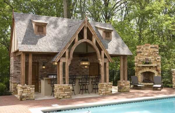 Стиль оформления открытой постройки будет диктовать ландшафтный дизайн. Если на территории есть бассейн или другой водоем, лучше разместить зону отдыха с мангалом неподалеку или вписать ее в общий ансамбль.
