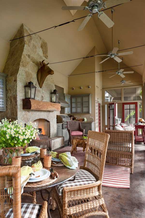 Плетеная мебель из ротанга, лозы – отличный выбор для зоны отдыха, совмещенной с летней кухней любого типа, – открытой или закрытой. На застекленной веранде, используемой в зимнее время года, уместны будут камин, деревянная мебель с мягкими подушками. Такие элементы украсят интерьер, создадут уютную обстановку.