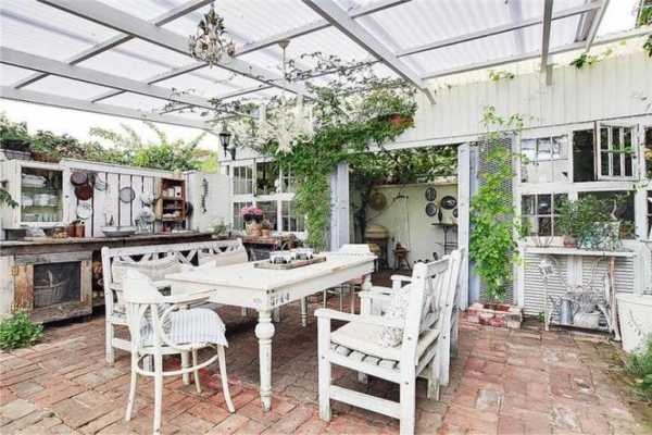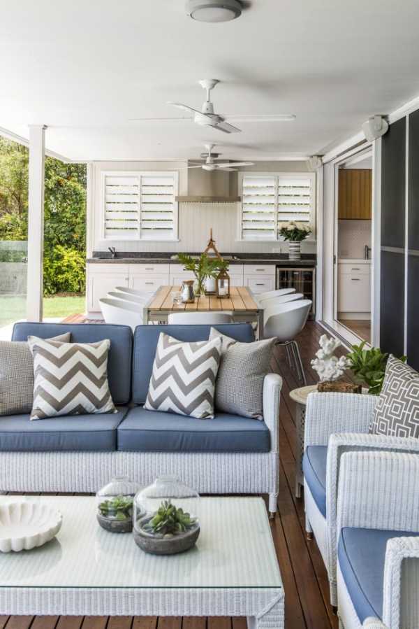 Красивый, легкий и непринужденный интерьер летней кухни пристроенной к дому