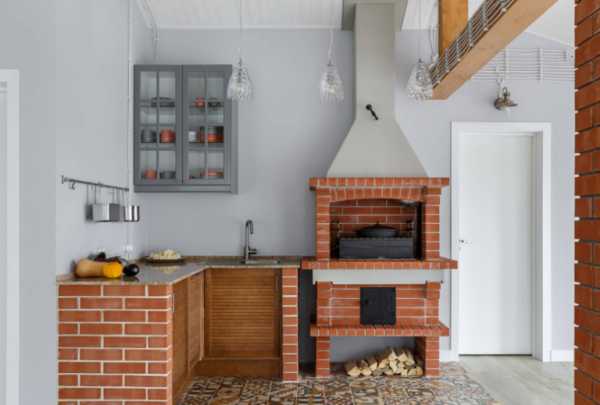 Главное назначение кухни – готовка пищи, поэтому основным элементом в ней является печь. В закрытой пристройке к дому лучше сделать ее из кирпича или установить газовую, что значительно ускорит процесс приготовления еды. В открытом варианте центральное место займет мангал или барбекю.