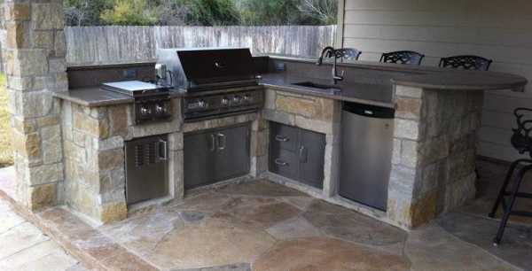 Стены для создания закрытой кухни делают из кирпича, пеноблоков, камня. Натуральный камень – наиболее привлекательный материал, отличающийся надёжностью и длительным сроком службы, но его приобретение не всем по карману.