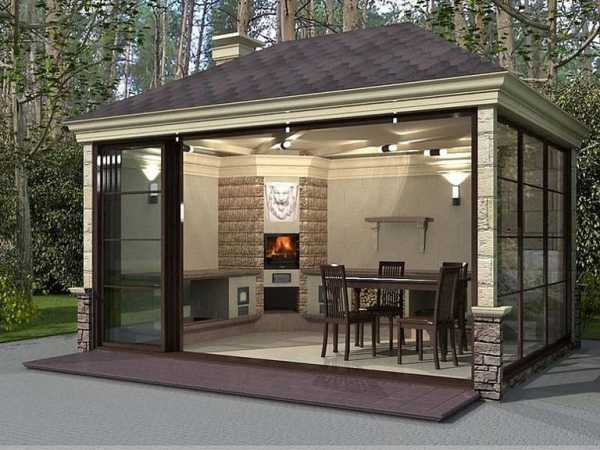 Закрытая летняя кухня с мангалом и обеденной зоной