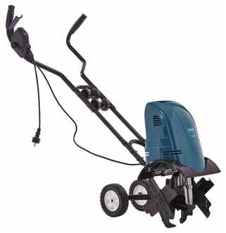 Открывает наш рейтинг лучших электрокультиватр Hyundai T 1500E. Несмотря на цифру «1500» в маркировке, мощность двигателя здесь – не 1500, а 1300 Вт. Мотор, скрытый под пластиковым кожухом в стиле «половинка пылесоса», приводит в действие фрезы через червячный редуктор, так что ломаться здесь практически нечему – достаточно проверять смазку в червячной паре. Никакого тарахтящего бензинового двигателя, растягивающихся цепей. Интересное решение – заменить сошник парой колес на практике одновременно и удобно, и нет: привыкший к тяжелой технике мужчина может посчитать этот культиватор игрушкой, а вот женщине с ним действительно будет удобно: достаточно наклонить его на нужный угол, чтобы задать глубину обработки, и катить его перед собой. Правда, сразу придется запастись хорошим удлинителем: со штатным шнуром далеко от розетки его не укатишь. Благодаря наличию колес, можно не обращать внимание на главный недостаток червячного привода – отсутствие свободного хода: наклоняем культиватор в другую сторону, чтобы не касаться фрезами земли, и можно спокойно катить его с выключенным мотором. С учетом длинного плеча рукоятей это нетрудно – весит весь культиватор в сборе лишь 13,5 кг. Конечно, при такой массе и мощности он явно не справится с тяжелым грунтом и большой глубиной обработки, но он на это и не рассчитывался. А вот для дачи и частного дома очень хороший культиватор — пройтись с ним по цветочным клумбам – самое то.