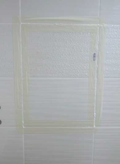 Первым делом необходимо, по периметру с обеих сторон люка, обклеить шов монтажным скотчем, как показано на рис. 10. Скотч необходимо приклеивать максимально близко к кромке плитки, чтобы в дальнейшем герметик не попал на лицевую часть плитки.