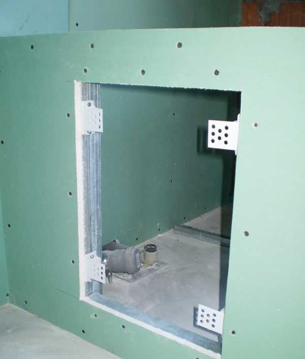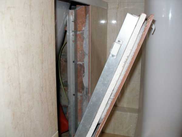 - В технологическую нишу устанавливают каркас люка. Его можно закрепить при помощи цементного раствора или других материалов. Сверху каркас обшивают влагостойким гипсокартоном.