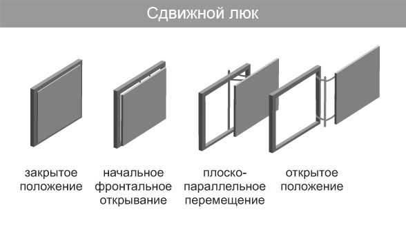 - Сдвижные. Люк сдвигается в сторону. Такой механизм открывания имеет смысл только в том случае, если сбоку от люка есть свободное место.