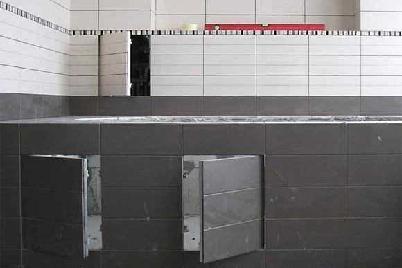 Существует и такая модификация, как люк-невидимка. Устанавливают такую конструкцию в специальных нишах, над шкафами либо под ванной. При этом отделка люка-невидимки осуществляется в том же цвете и теми же материалами, что и стенки. Это так называемые скрытые люки для ванной – люк для ванной под плитку легко сделать незаметным.