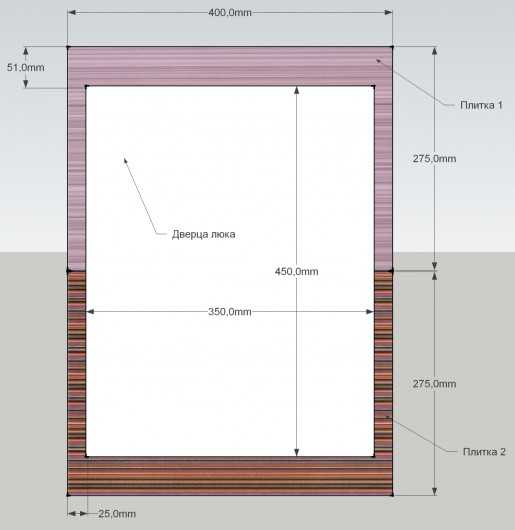 1. Необходимо аккуратно разметить раскладку плитки на будущей зашивке. На дверце должна располагаться целая плитка или, ясное дело, парное число ее. Обычно (как и в нашем случае) плитка, закрепленная на люке выходит за пределы дверцы на несколько сантиметров. Исходя из разметки выбирают место установки и размеры будущей конструкции. В некоторых городах их изготавливают по заказу, так, что размеры могут быть любые. Стоимость изготовления этого люка около 120$.