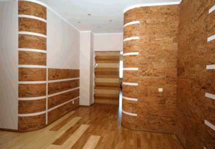 Еще одним достаточно распространенным материалом является пробка. Реализуется он особого размера плитами, они в процессе монтажа очень просто монтируются на подготовленную стеновую поверхность.