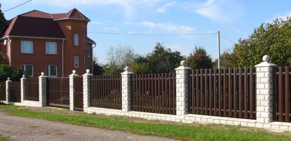 Вот фото того, как выглядит сочетание забора из кирпича и металлического штакетника