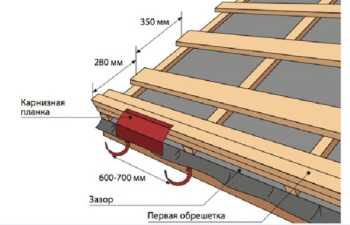 Если монтируется водосток, на нижней доске обрешетки укрепляют кронштейны для желобов. Сверху прикручивают карнизную планку, так, чтобы она перекрывала ближнюю от фасада стенку желоба. Конец гидроизоляционной мембраны выводят в водосток, располагая его по карнизной планке. Далее остается только накрыть крышу металлочерепицей.