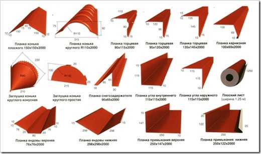 - Дополнительные детали, предусмотренные конструкцией крыши — конек, карнизный свес, детали, примыкающие к окнам мансарды и дымоходной трубе. Они должны быть установлены на этапе монтажа обрешетки перед тем, как накрыть крышу металлочерепицей.