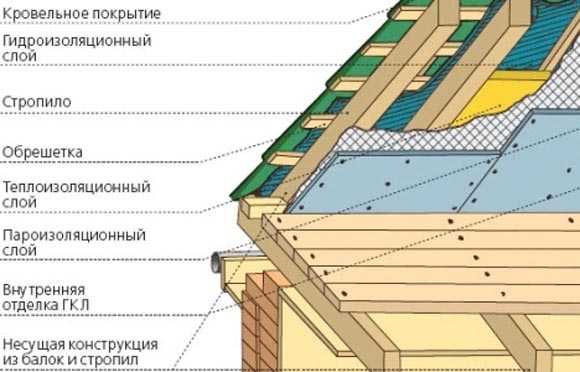 Поверх пароизоляции укладывают слой утеплителя. Зачастую материалы, используемые для этих целей, обладают и звукоизоляционными свойствами (читайте также: «Звукоизоляция крыши из металлочерепицы — монтаж и устройство»). Если помещение используется для ведения домашнего хозяйства или если планируется делать «холодную» крышу, то можно обойтись и без теплоизоляции.Третий слой «пирога» крыши — гидроизоляционная пленка. Она должна защитить дом от конденсата и случайно просочившейся под кровлю воды. Ее аккуратно укладывают с нахлестом, а швы соединяют между собой.
