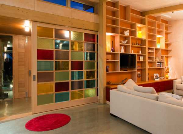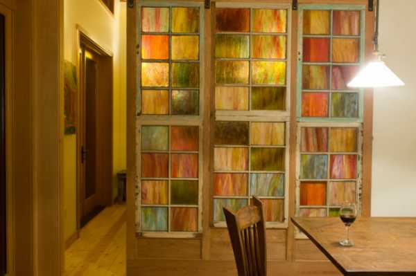 Раздвижная стеклянная перегородка с разноцветными стеклянными вставками