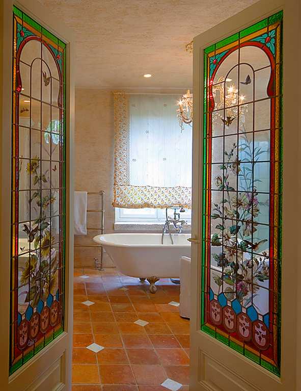 Красивый яркий витраж на стеклянных дверей ведущих в ванную комнату