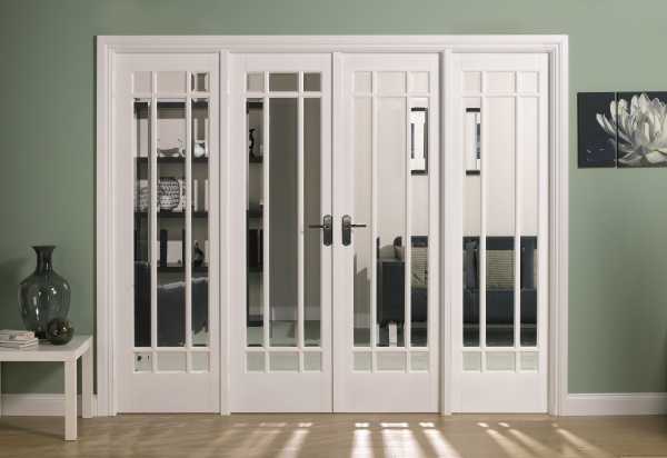 В продаже встречаются и стеклянные двустворчатые двери. Они могут пригодиться, если в вашей квартире широкие дверные проемы. Удобство такой конструкции заключается в следующем: