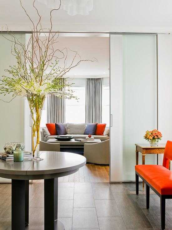 Применяя в интерьере раздвижные межкомнатные перегородки, можно замаскировать вход в комнату или, наоборот, сделать его модным и ярким