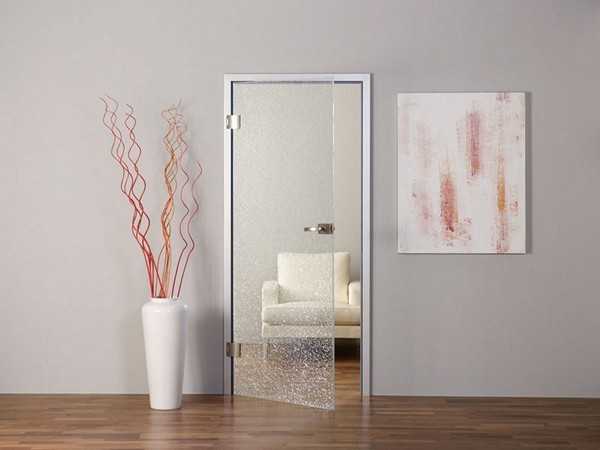 Стеклянные межкомнатные распашные двери без коробки могут открываться в любую сторону, что делает их особенно удобными. Недостатком такого решения может стать слабая изоляция тепла и шума. Плотное закрывание достигается при использовании дверной коробки, а в данном случае она отсутствует. Фиксация дверного полотна происходит при помощи навесов, которые размещают на потолке и полу. Для того чтобы дверь могла вращаться на оси, полотно не должно вплотную прилегать к потолку или полу.