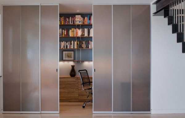 Раздвижные матовые стеклянные межкомнатные двери не слишком расширяют пространство визуально. В отличие от прозрачных такая перегородка хорошо скрывает внутреннее пространство от взгляда извне, поэтому матовые двери часто ставят в ванные комнаты и туалеты.