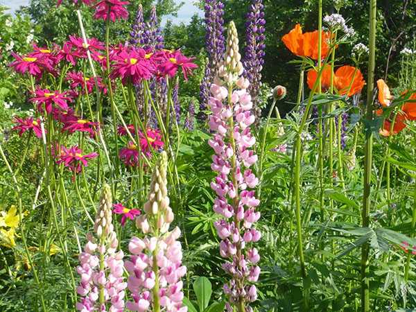 Растения высотой до одного метра пышно расцветают на солнце, не любят слишком удобренных почв и благодаря мощному корневищу умеют выживать в условиях дефицита влаги. В саду люпин – идеальный сосед для нивяника, разноцветных аквилегий, многолетних маков.