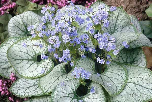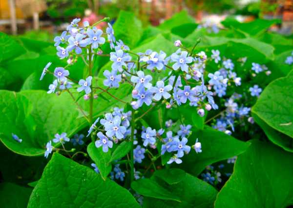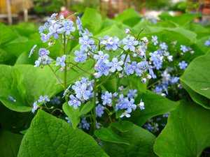 В это время под кронами деревьев, возле дорожек и водоемов, под защитой стен и оград появляются голубые цветы бруннеры. Растения высотой от 30 до 50 см, с декоративной заостренно-сердцевидной листвой предпочитает селиться в полутени, где есть достаточно влаги и питания для пышных лиственных розеток и возвышающихся над ними соцветий.