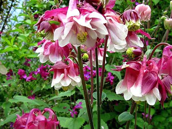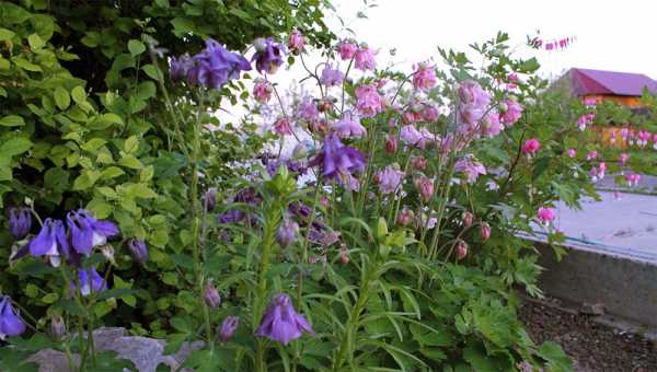 Когда в конце мая в саду отцветают поздние тюльпаны и нарциссы, над землей начинает подниматься декоративная листва аквилегий или водосборов. Причудливые колокольчики этого, одного из самых неприхотливых многолетников для дачи, как на фото цветов, раскрываются на высоких прямостоячих цветоносах.