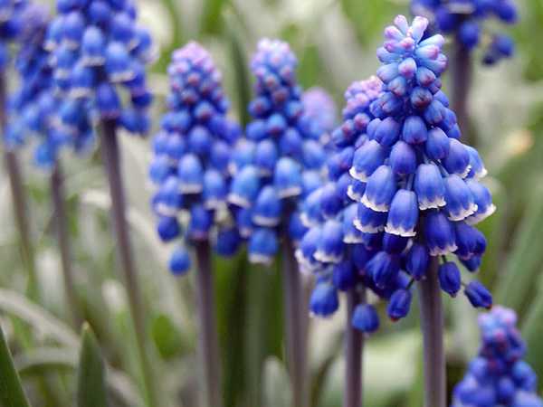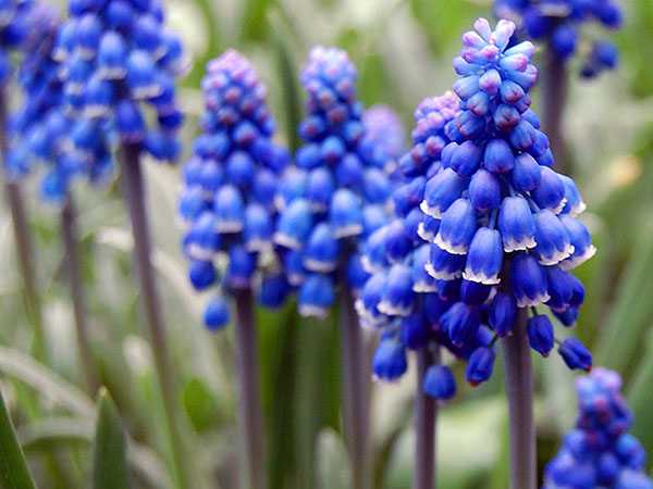 С апреля и почти до конца мая на клумбах появляются невысокие, от 10 до 20 см, стебли, увенчанные соцветиями из небольших, напоминающих колокольчики цветков. Это мускари или мышиный гиацинт. Скромное декоративно-луковичное растение можно по праву включить в список неприхотливых цветов для дачи и сада.