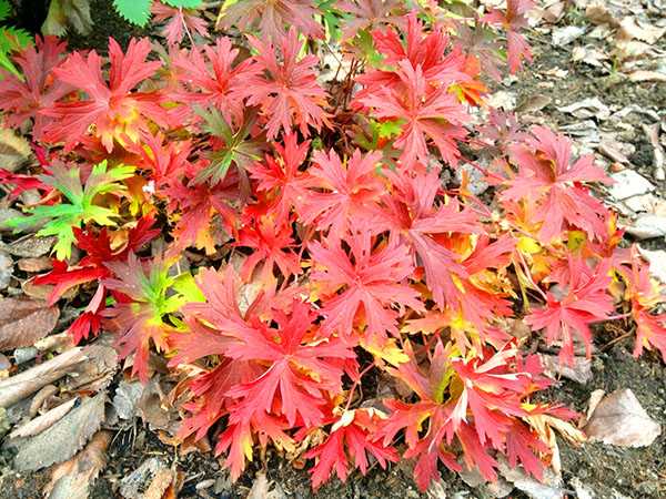 Когда сезон цветения завершается, сад не пустеет благодаря декоративной разрезной листве гераней. К осени она окрашивается в яркие золотистые, оранжевые и пурпурные тона и до самого снега оживляет потускневшие клумбы и горки.