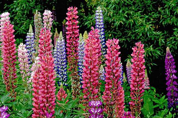 Люпины не только относятся к самым неприхотливым садовым цветам. Эта многолетняя культура одна может расцветить весь участок. Синие, белые, розовые, пурпурные и двухцветные колосовидные соцветия появляются в первой половине июня, а затем о второй половине лета начинается повторное цветение.