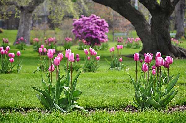 Умело подобрав сорта, с помощью одних только тюльпанов высотой от 10 до 50 см можно украсить участок от клумб до альпийской горки. Цветение первых тюльпанов начинается в марте, а самые поздние сорта увядают в конце мая.