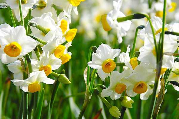 В зависимости от сорта растения достигают высоты от 30 до 60 см. Цветки могут быть как простыми, так и махровыми, с короткой или длинной короной. Нарциссы предпочитают участки с рыхлой плодородной почвой. Они хорошо растут на солнце и под распускающимися в это время кронами. Главное, чтобы грунт, в который осенью были посажены луковицы, не был перенасыщен влагой.