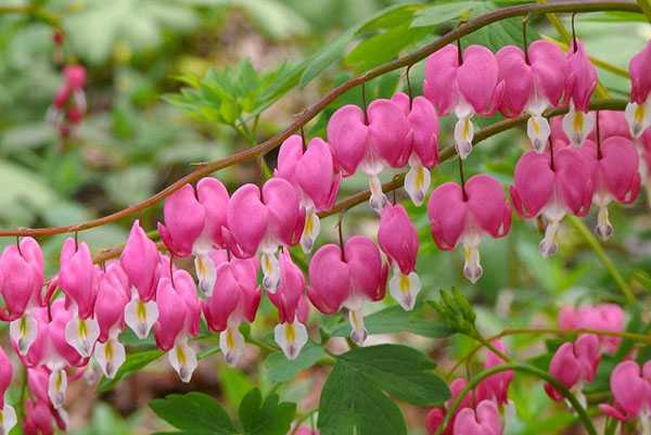 Благодаря мощным корневищам дицентра без потерь переносит зимние холода. Отмирающая осенью листва с приходом тепла вновь поднимается над грунтом, у разных сортов достигая высоты от 30 до 100 см. Эффектное растение в мае покрывается собранными в кистевидные соцветия белыми, розовыми или двухцветными венчиками причудливой, напоминающей сердечко формы. Цветение длится около месяца, причем под прозрачной тенью молодой листвы поникающие соцветия неприхотливого растения для дачи и сада выглядят ярче и держатся дольше.
